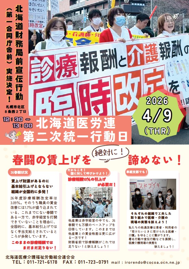 4月9日 第二次統一行動日 宣伝行動へ参加ください 4月9日の第二次産別統一行動の取り組みとして、北海道財務局(第一合同庁舎内)に向けて、さらなる診療報酬や賃上げ、財源上積みを求める街頭宣伝行動を行います。 ビラを作成しましたので活用いただき、参加を広げていただくようお願いします。 4月9日 第二次統一行動日 宣伝行動ビラ