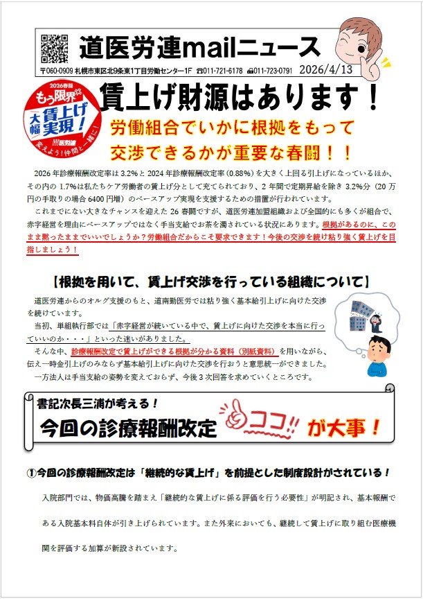 道医労連メールニュース 4/13号を発行しました 25道医労連mailニュース2026.04.13 26春闘賃上げ財源はあります! 25道医労連mailニュース2026.04.13 26春闘賃上げ財源はあります!のニュースを発行しました。 みんなで一致団結して、賃上げを勝ちとりましょう!!