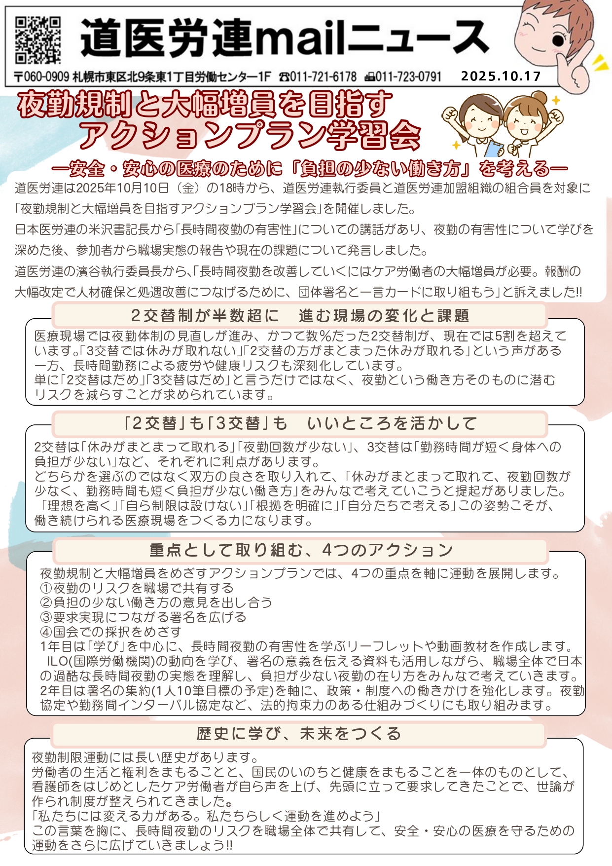 詳細につきましては道医労連発出の文書をご確認いただくか、下記問い合わせへお問い合わせください。