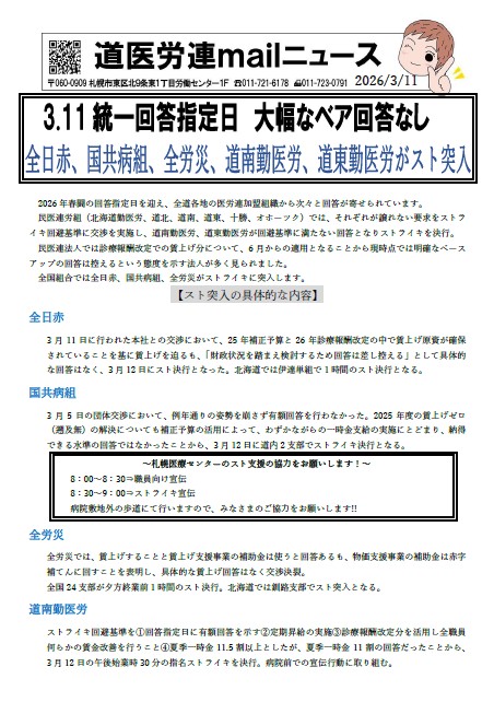道医労連メールニュース 3/12号を発行しました 25道医労連mailニュース2026.3.12 産別統一行動日 25道医労連mailニュース2026.3.12 産別統一行動日のニュースを発行しました。