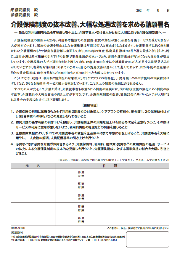 介護保険制度の抜本改善、大幅な処遇改善を求める請願署名