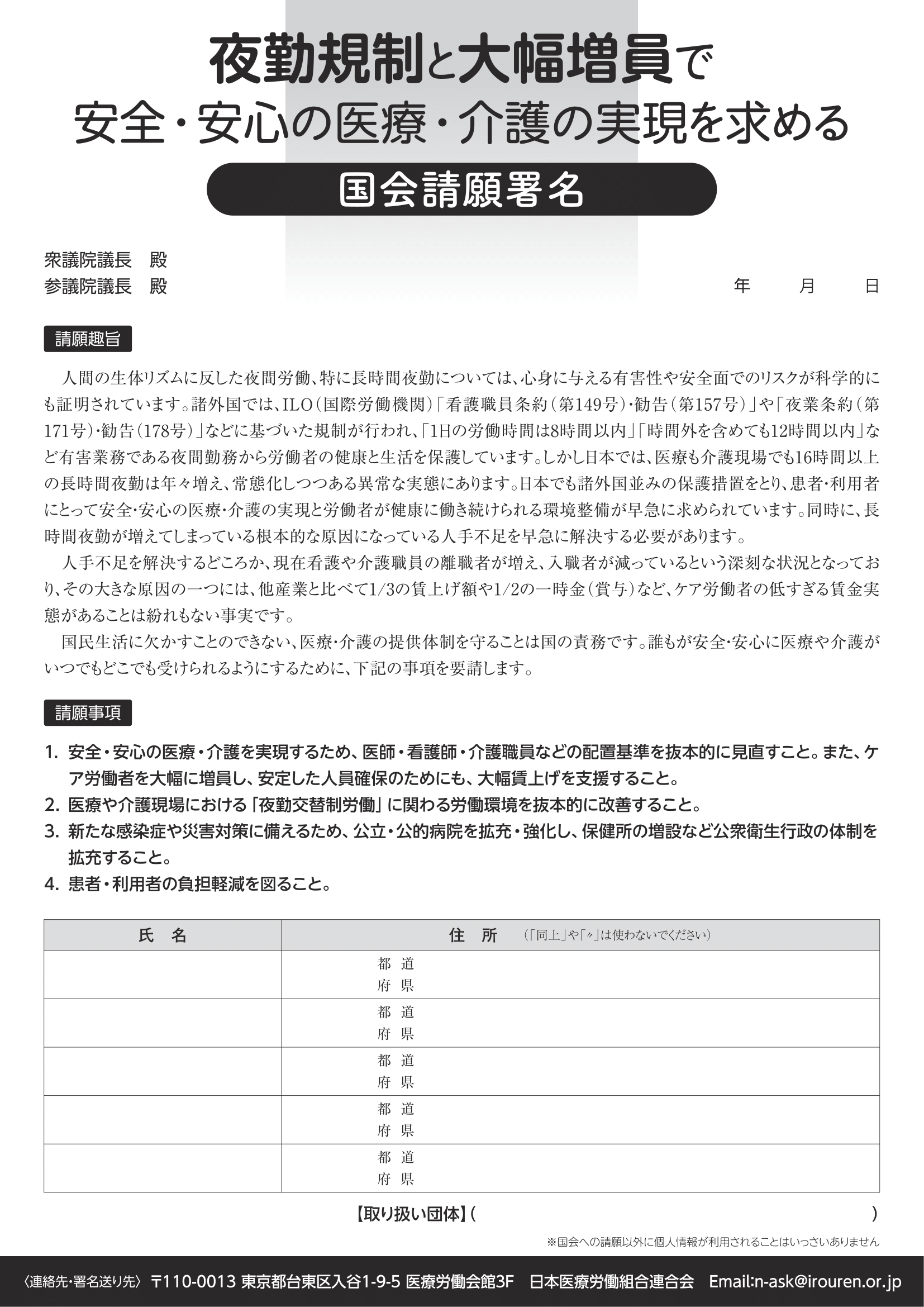 夜勤規制と大幅増員で安全・安心の医療・介護の実現を求める国会請願署名